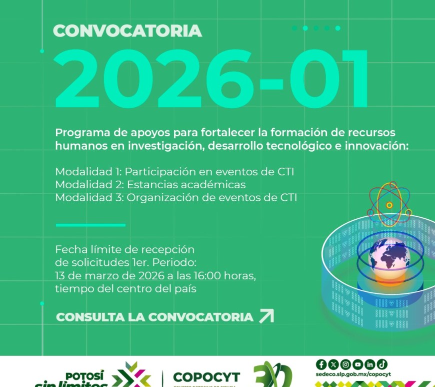 -La nueva convocatoria de apoyos fortalece la formación en investigación, desarrollo tecnológico e innovación con enfoque en niñez y juventud. Con el objetivo de consolidar el talento científico y tecnológico en el Estado, el Consejo Potosino de Ciencia y Tecnología (Copocyt), con recursos del Fideicomiso 23871, publicó la Convocatoria 2026-01 del «Programa de apoyos para fortalecer la formación de recursos humanos en investigación, desarrollo tecnológico … Continúa leyendo San Luis abre nuevas oportunidades para la formación científica