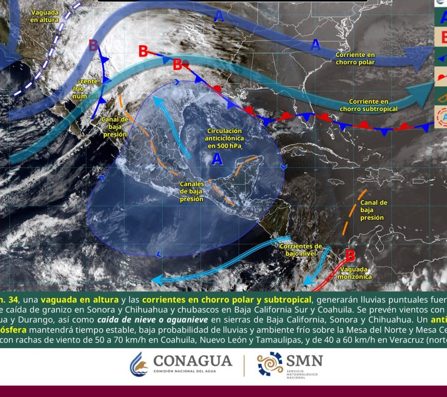 Cielo medio nublado a nublado con lluvias aisladas en Chihuahua y Coahuila. Cielo con nubes dispersas y sin lluvia en el resto de la región. Por la mañana, ambiente frío a fresco, así como muy frío en zonas altas y gélido con heladas en zonas de Chihuahua y Durango. Durante la tarde, ambiente templado a cálido, así como caluroso en Nuevo León y San Luis … Continúa leyendo Pronóstico Meteorológico
