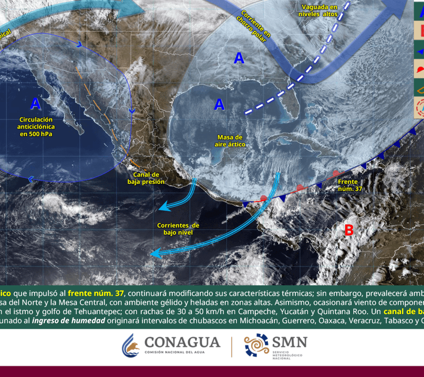 Cielo parcialmente nublado durante el día y sin lluvia en la región. Ambiente frío a muy frío durante la mañana, y ambiente gélido en Chihuahua y Durango. Por la tarde, ambiente cálido en la región, así como ambiente caluroso en Durango (oeste y noreste) y San Luis Potosí, así como ambiente muy caluroso en Coahuila (noreste) y Nuevo León (norte y este). Viento de dirección … Continúa leyendo Pronóstico Meteorológico