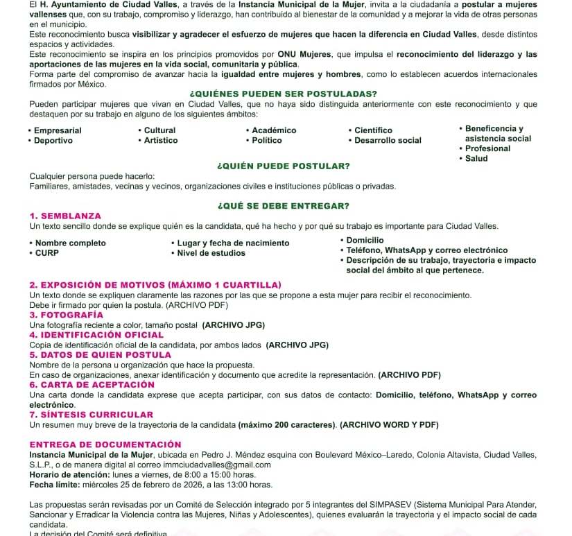 CIUDAD VALLES, S.L.P. – El Presidente Municipal de Ciudad Valles, David Armando Medina Salazar, a través de la Instancia Municipal de la Mujer, que preside la Maestra María Rebeca Terán Guevara, convoca a la ciudadanía a postular a mujeres vallenses que, con su trabajo, compromiso y liderazgo, han contribuido al bienestar de la comunidad y a mejorar la vida de otras personas en el municipio, … Continúa leyendo Ayuntamiento abre convocatoria para postular a la mujer Vállense del año 2026