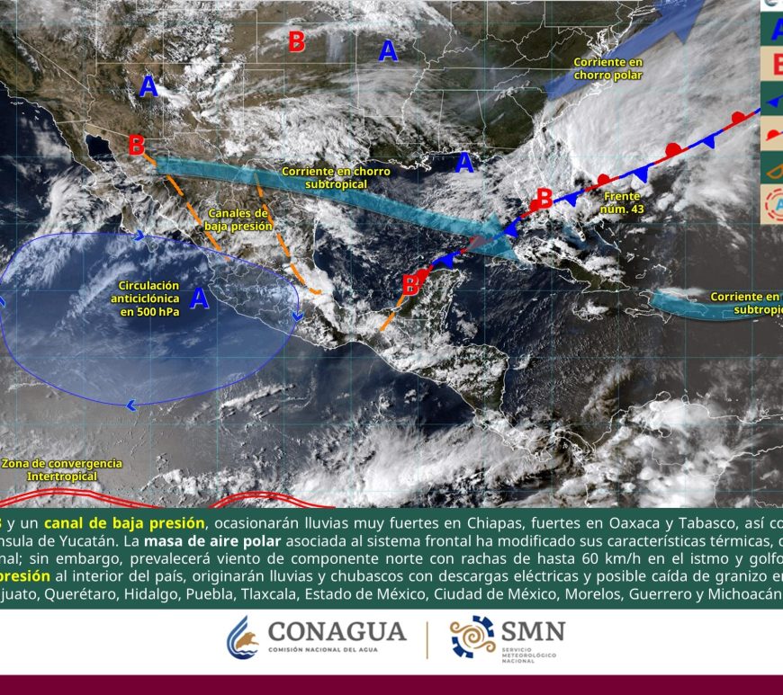 Cielo medio nublado a nublado con probabilidad de lluvias fuertes en Nuevo León, mismas que podrían originar encharcamientos, inundaciones y deslaves. Intervalos de chubascos en Coahuila y San Luis Potosí, lluvias aisladas en Chihuahua, Durango y Zacatecas. Dichas lluvias se podrían acompañar con descargas eléctricas y posible caída de granizo. Sin lluvia en Aguascalientes. Por la mañana, ambiente frío a fresco con bancos de niebla en zonas … Continúa leyendo Pronóstico Meteorológico