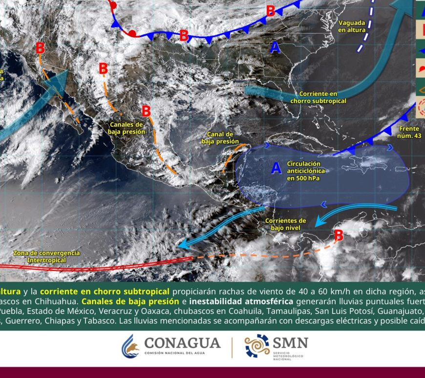 En el transcurso del día, cielo medio nublado a nublado con lluvias puntuales muy fuertes en Coahuila (norte) y lluvias puntuales fuertes en Chihuahua (norte y noreste), Nuevo León (centro y sur) y San Luis Potosí (norte y sur), las cuales podrían ocasionar encharcamientos, inundaciones y deslaves, e incremento en los niveles de ríos y arroyos. Además, lluvias aisladas en Durango, Zacatecas y Aguascalientes. Las lluvias … Continúa leyendo Pronóstico Meteorológico