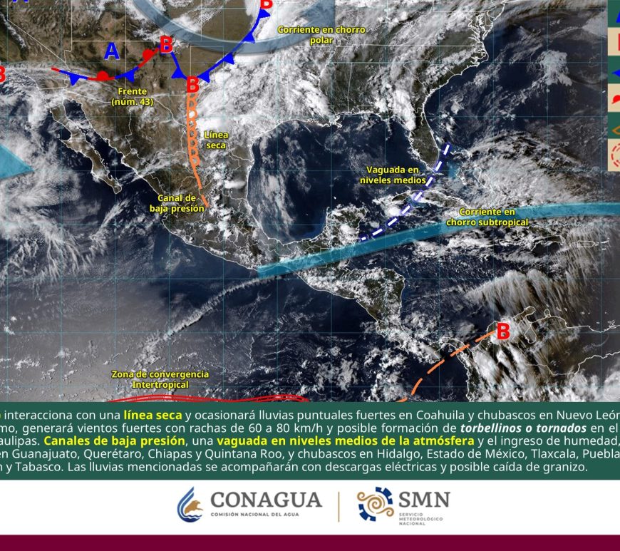 Cielo medio nublado a nublado durante el día con lluvias puntuales muy fuertes en Coahuila y Nuevo León, así como fuertes en Chihuahua y San Luis Potosí; las cuales podrían generar encharcamientos e inundaciones. Chubascos en Durango, Zacatecas y Aguascalientes. Todas con descargas eléctricas y posible caída de granizo. Por la mañana, ambiente frío, y muy frío en zonas serranas de Chihuahua y Durango. Durante la … Continúa leyendo Pronóstico Meteorológico