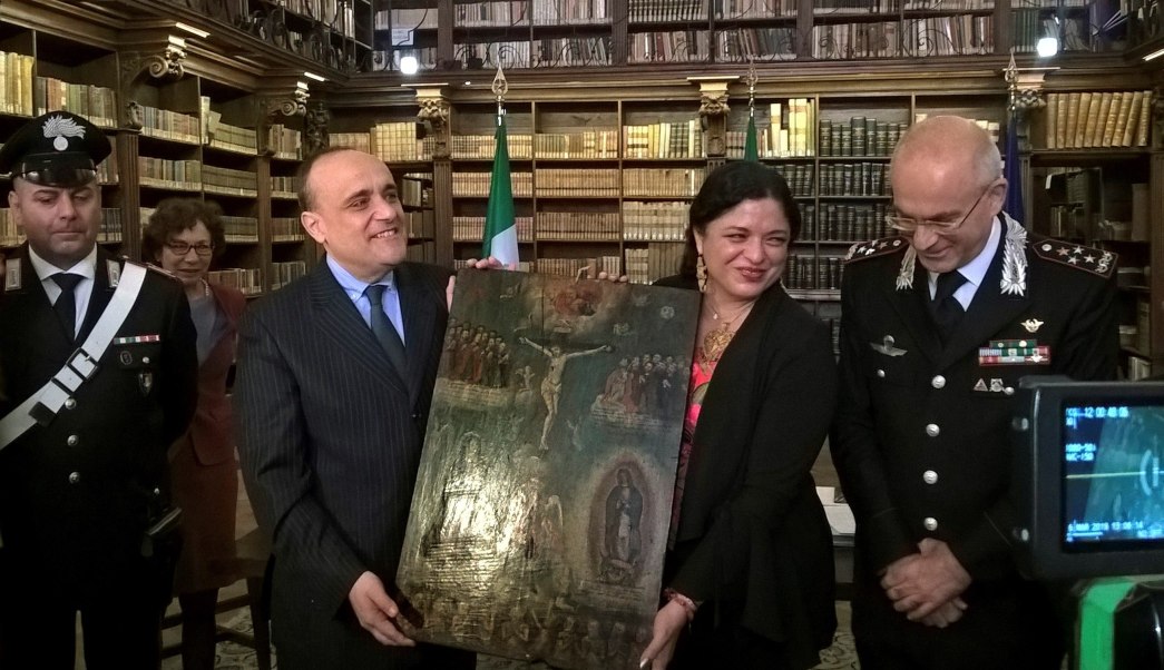 Italia devolvió oficialmente a México 594 pinturas exvoto sustraídas ilegalmente al patrimonio cultural mexicano y exportadas al país europeo, en una ceremonia celebrada en la Sala della Crociera del Ministerio para los Bienes y Actividades Culturales de Roma.