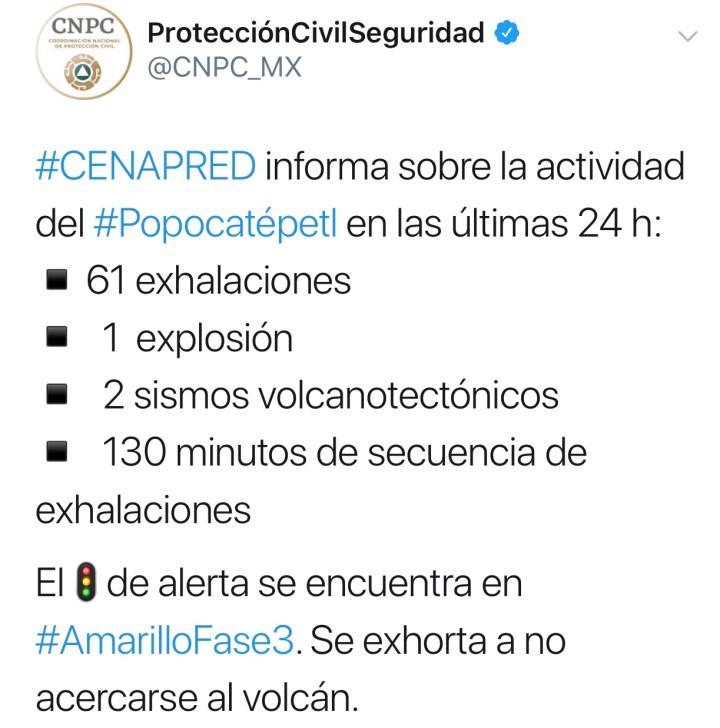 Con base en el análisis de la información disponible, el Comité Científico Asesor del volcán Popocatépetl recomendó cambiar la fase del Semáforo de Alerta Volcánica de Amarillo Fase 2 a Fase 3, lo cual constituye una medida preventiva ante los cambios observados.