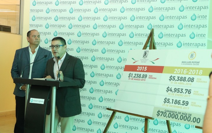 Finalmente, se recordó que la administración del ex Alcalde, Ricardo Gallardo Juárez, entró en funciones a partir del 1 de octubre de 2015, destacando que un año después en 2016, el INTERAPAS al negociar nuevamente los términos del contrato con AXIOMA y ya estando en funciones la administración gallardista, de manera por demás extraña, y sin fundamento legal alguno, el valor de la persona ascendió a 5 mil 388 pesos, lo que finalmente acumuló un pago millonario por estos servicios.