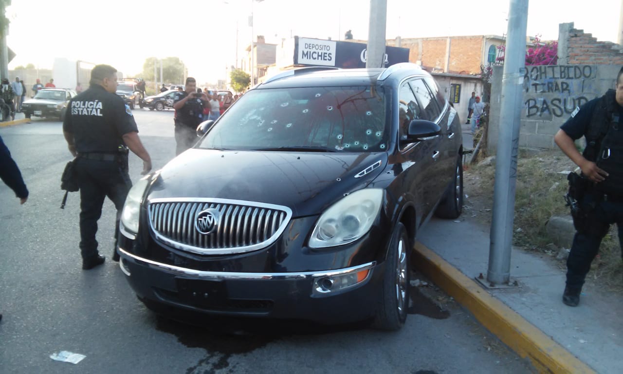 El área de Servicios Periciales de la FGESLP lleva a cabo el procesamiento de la escena de los hechos, así como el levantamiento de indicios y casquillos. La camioneta presenta múltiples impactos de bala en parabrisas, lado del piloto y copiloto.