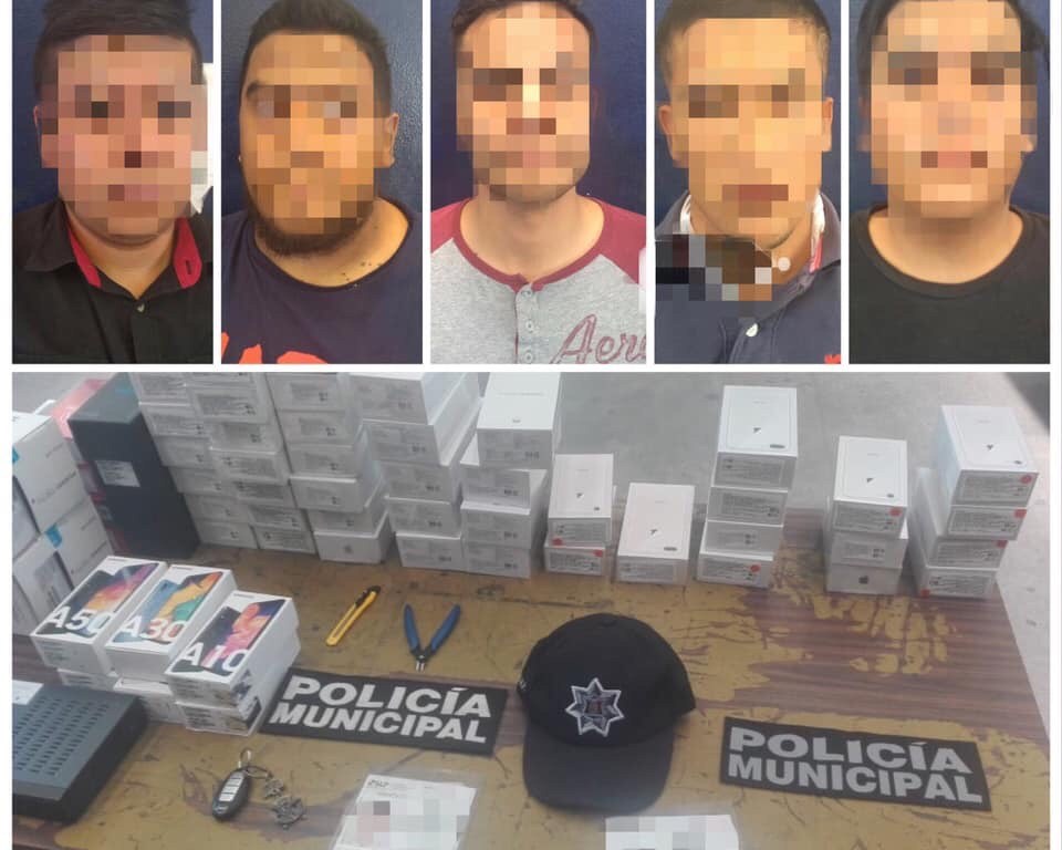 Agentes municipales de la Dirección General de Seguridad Pública Municipal de la capital efectuaron la detención de cinco hombres quienes en un intento de robo con violencia sustrajeron teléfonos móviles de diversas marcas, con un monto aproximado de novecientos cincuenta mil pesos de un Centro de Atención Telefónica.
