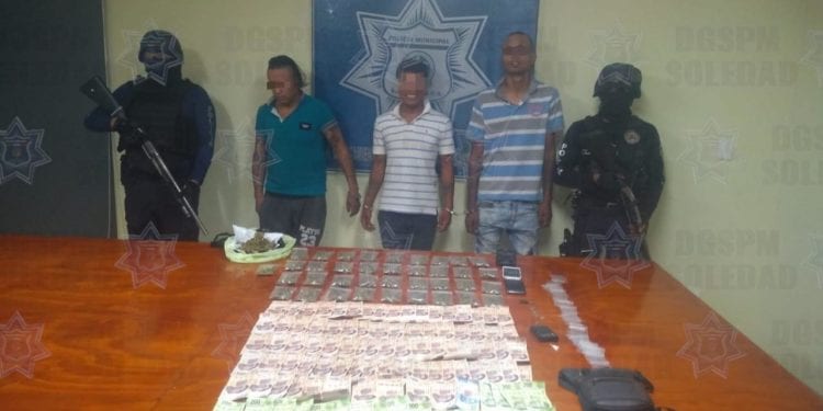 La Dirección General de Seguridad Pública de Soledad informó que tres sujetos fueron detenidos en la colonia Misión de los Ángeles, a los que se les encontró entre sus pertenencias la cantidad de 49 mil pesos en efectivo, marihuana, cristal y teléfonos celulares.