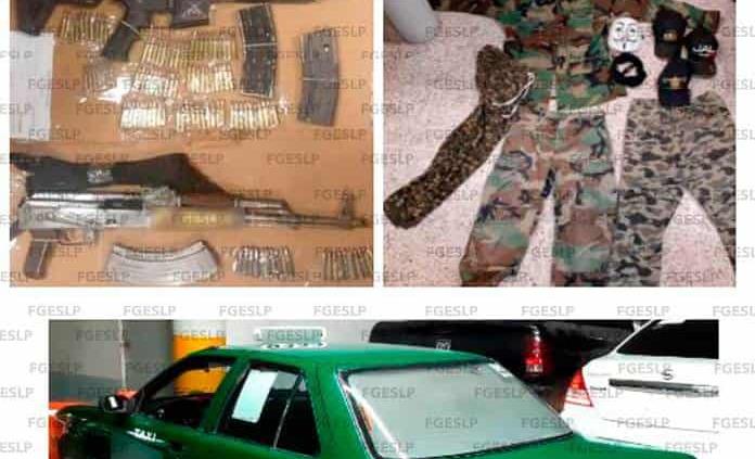 Tres personas, que viajaban en un taxi, entre ellas una mujer, fueron detenidas al encontrarlas en posesión de armas largas, equipo táctico y droga, las armas tenían las insignias de un grupo delictivo, los transgresores de la ley quedaron a disposición de la Agencia del Ministerio Público, para que se proceda en su contra por los delitos que se les lleguen a configurar.