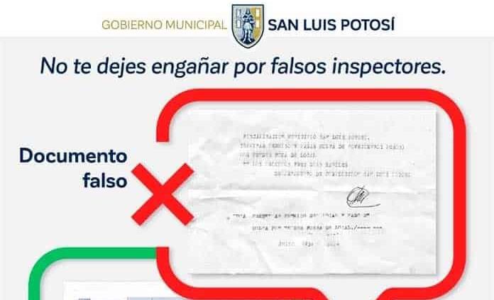 Gabriel Andrade Córdova, titular de la dependencia, informó que a decir de los denunciantes, los pseudo inspectores lanzan amenazas de multas por presuntas irregularidades presentando un documento, falso también, con la leyenda «Fiscalización municipio San Luis Potosí».