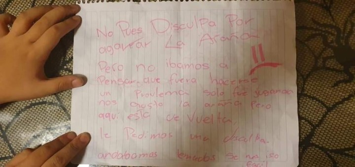 Posteriormente la misma mujer dio a conocer por dicho medio que los ladrones devolvieron la araña que habían robado, la cual dejaron en una bolsa color negro con un mensaje de disculpas.