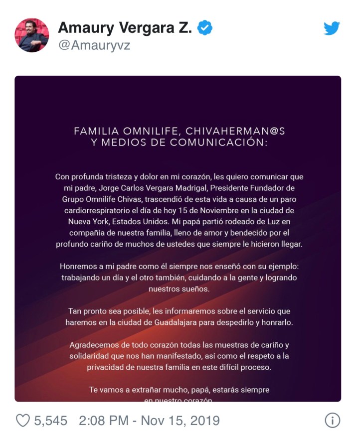 “Con profunda tristeza y dolor en mi corazón, les quiero comunicar que mi padre, Jorge Vergara Madrigal, Presidente Fundador de Grupo Omnilife Chivas, trascendió de esta vida a causa de un paro cardiorrespiratorio el día de hoy 15 de noviembre en la ciudad de Nueva York, Estados Unidos.