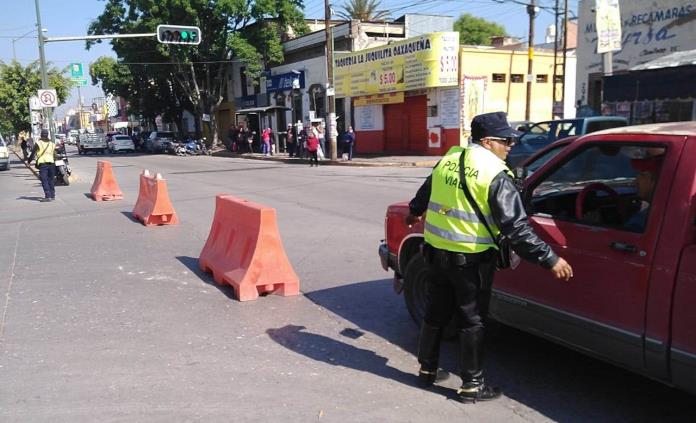 En el perímetro del mercado República hay elementos de tránsito con barreras que anuncian a los automovilistas del cierre y del lleno total que supuestamente hay en el mercado.