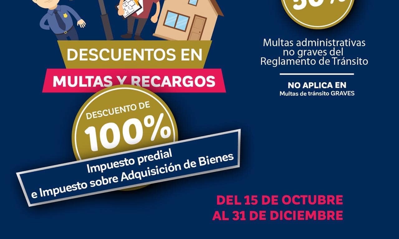 Recordó que la meta proyectada es de 80 millones de pesos, sobre todo en adeudos relacionados con el impuesto predial. De ahí que el descuento es del 100% en multas y recargos para quienes arrastran adeudos en el predial, así como en trámites extemporáneos del traslado de dominio; y en las multas de tránsito es de un 50%, para automovilistas que pasaron los 10 días y no aprovecharon ese descuento.