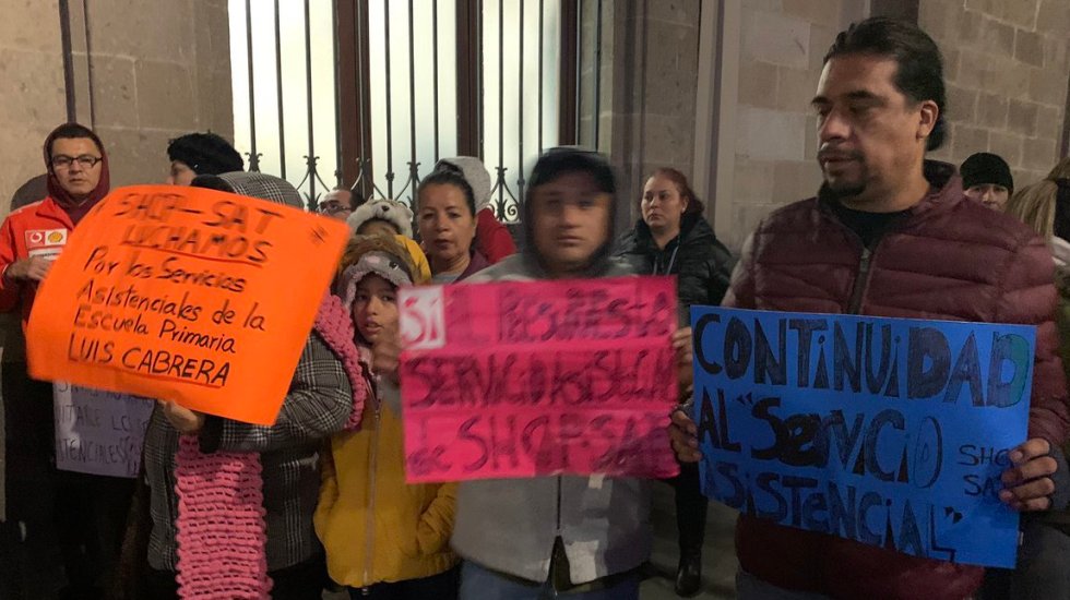 Un grupo de trabajadores de la Secretaría de Hacienda y del Servicio de Administración Tributaria (SAT) protestaron frente a Palacio Nacional por el supuesto retiro de servicio asistencial para que los padres puedan llevar a sus hijos a la escuela.