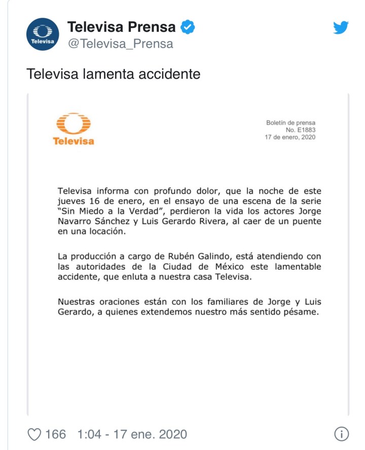 «Televisa informa con profundo dolor que la noche de este 16 de enero, en el ensayo de una escena de la serie ‘Sin miedo a la verdad, perdieron la vida los actores Jorge Navarro Sánchez y Luis Gerardo Rivera,al caer de un puente en una locación«, dijo la empresa en un comunicado.