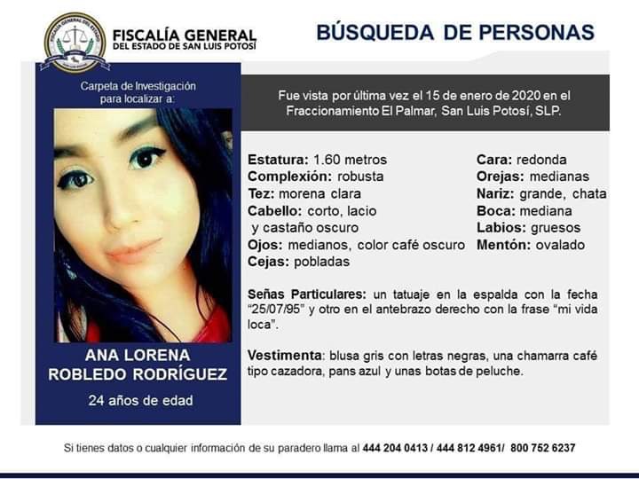 Por las características en la ficha de extravío que expide la Fiscalía de Justicia del Estado, se trata de Ana Lorena Robledo Rodríguez de 24 años de edad, quien fue reportada como desaparecida el pasado 15 de enero del año en curso en la capital potosina.