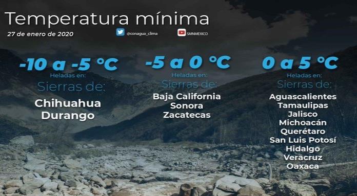 Mientras que para las sierras de Aguascalientes, Hidalgo, Jalisco, Michoacán, Oaxaca, Querétaro, San Luis Potosí, Tamaulipas y Veracruz estarán de 0 a 5 grados Celsius; en las zonas altas de los estados mencionados habrá heladas.