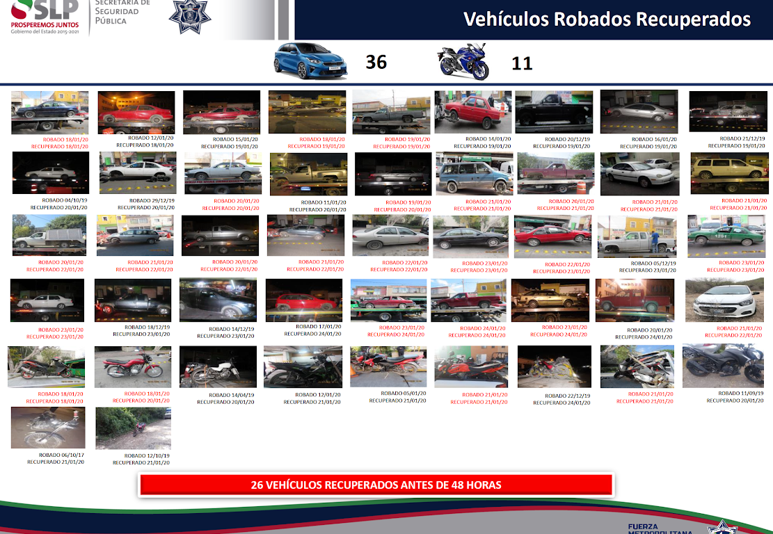 Como resultado de los operativos implementados en diferentes puntos de San Luis Potosí, elementos de la Secretaría de Seguridad Pública del Estado (SSPE), recuperaron un total de 47 vehículos que contaban con reporte de robo.