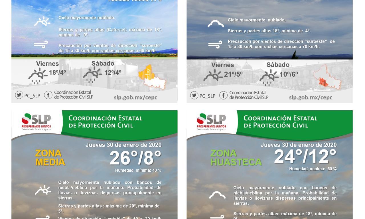 De acuerdo al pronóstico del Servicio Meteorológico Nacional (SMN), se prevén vientos de 20 a 30 kilómetros por hora con rachas que podrían llegar a los 70 kilómetros por hora para las zonas Centro, Altiplano y Media, informó la Coordinación Estatal de Protección Civil.