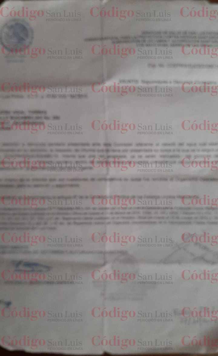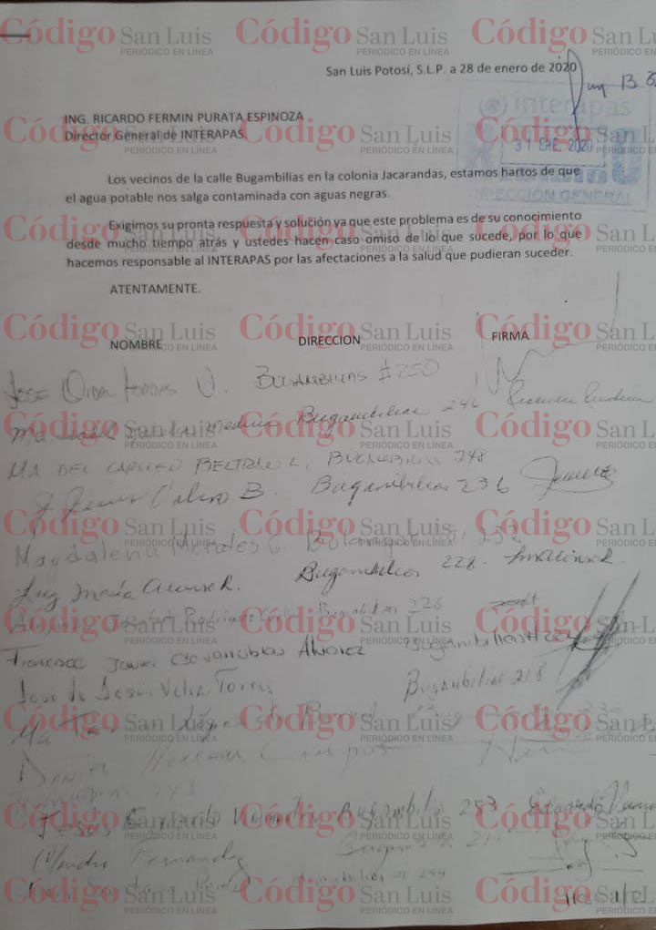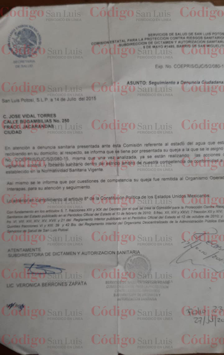 En julio de 2015, acudieron a la Coepirs para que la dependencia realizara un estudio del agua que llega a sus casas y determinaron que, efectivamente, era agua contaminada. No obstante, como la reparación de este problema está en manos del organismo operador, la competencia de la comisión terminó con el informe al Interapas. En ese entonces, el folio 2322, con fecha del 27 de julio de 2015 fue la prueba de los vecinos.