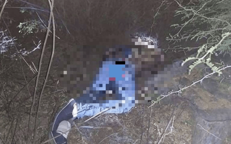 Peritos de Criminalística y Servicios Periciales tuvieron a la vista el cuerpo de un individuo que se encontraba acostado boca abajo y tenía las manos atadas hacia atrás, vestía pantalón de mezclilla en color azul, zapatos azules y playera café, con la que se presume le cubrieron la cabeza antes de ultimarlo.