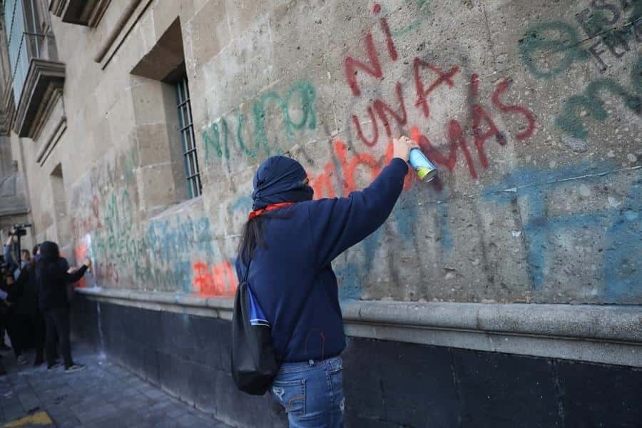 Durante la protesta, que arrancó a las 07.00 hora local (13.00 GMT) coincidiendo con el comienzo de la conferencia matutina del presidente de México en ese mismo recinto, las mujeres pintaron al menos unos 80 metros de la fachada del Palacio Nacional.