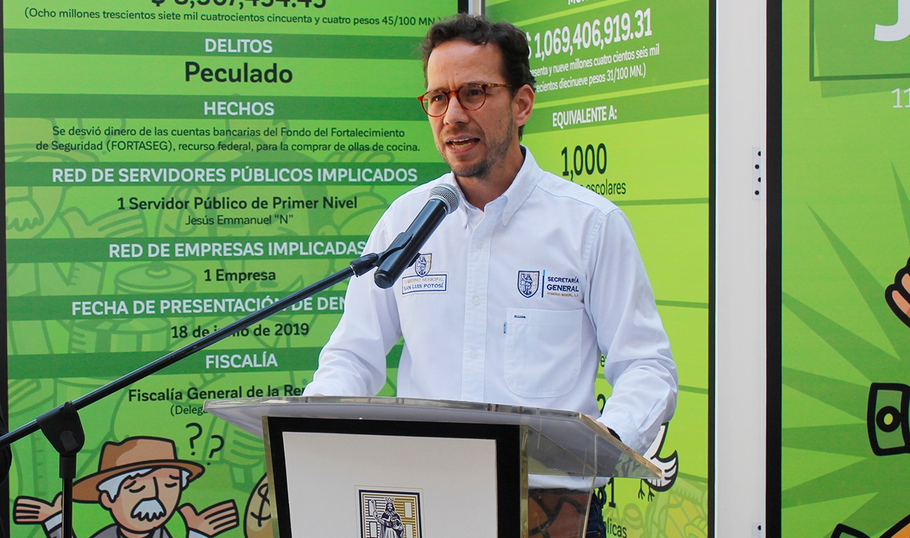“A un año de la primera de las 11 denuncias presentadas por el robo de más de mil 69 millones de pesos, necesitamos que haya un acto contundente, que haya responsables y que haya cárcel para quienes le vieron la cara a la sociedad potosina y contra quienes dañaron gravemente a San Luis Potosí”, declaró categórico el Secretario General del Ayuntamiento, Sebastián Pérez García.