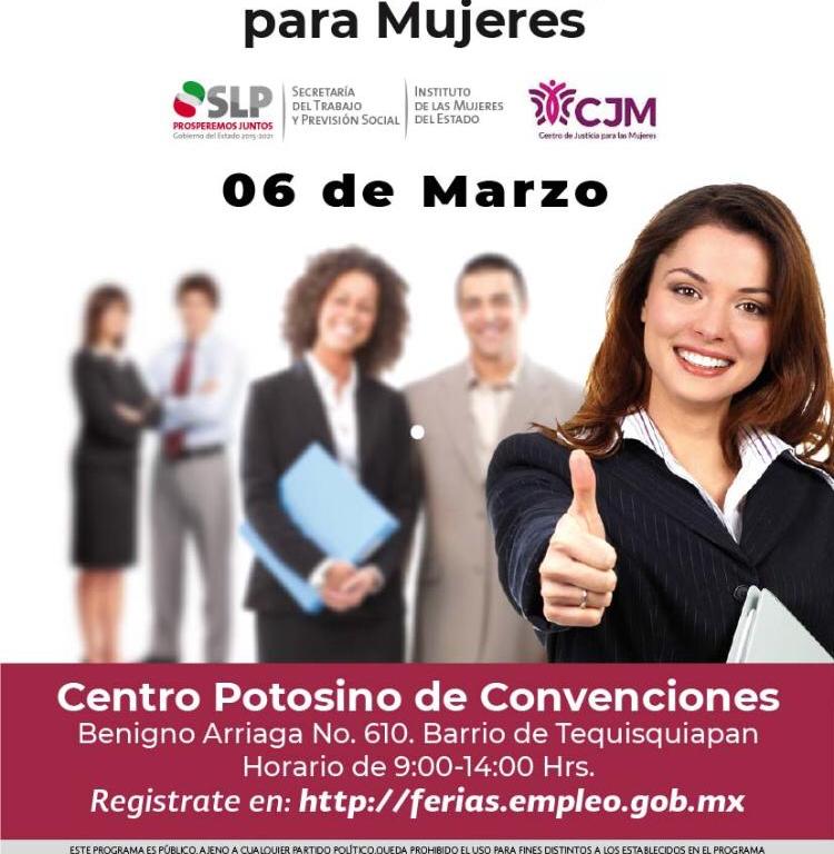 En el marco del Día Internacional para la Mujer, la Secretaría del Trabajo y Previsión Social del Gobierno del Estado de San Luis Potosí (STPS) a través del Servicio Nacional de Empleo (SNE), proyecta para este viernes 6 de marzo, la “Feria de Empleo para Mujeres” que se llevará a cabo en el Centro Potosino de Convenciones.