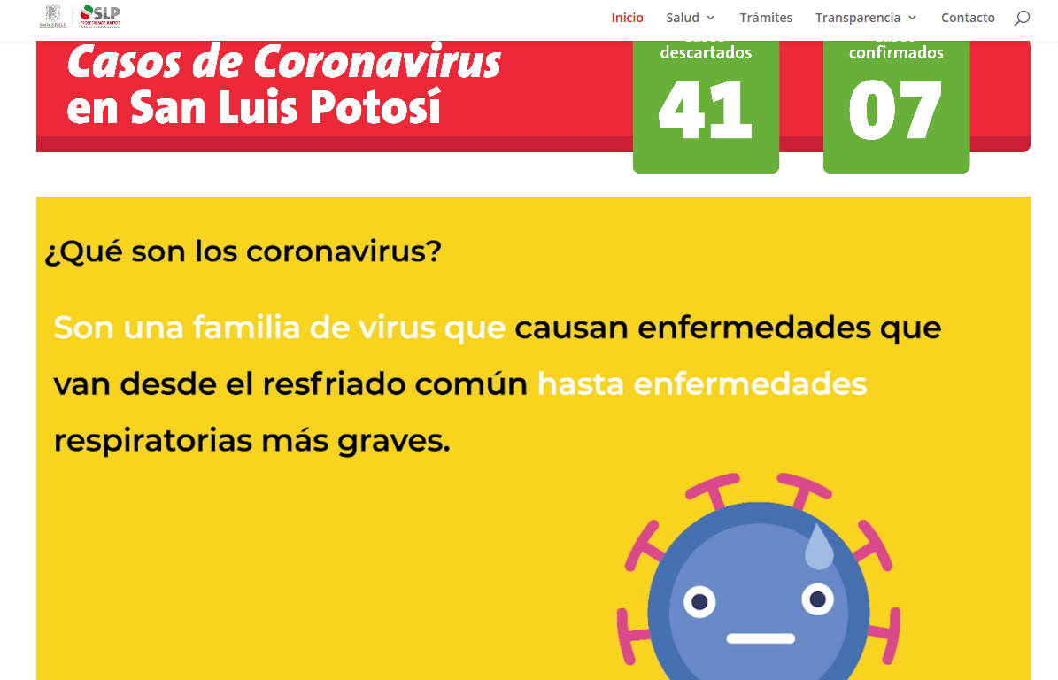 El Gobierno del Estado por medio de los Servicios de Salud, pone a disposición de la población el micro sitio www.slpcoronavirus.mx que tiene el propósito de dar a conocer las medidas preventivas sobre esta enfermedad, así como la información actualizada de los casos descartados y confirmados, de la misma manera, responde a las preguntas más frecuentes, información para viajeros, filtros familiares y escolares, entre otros.