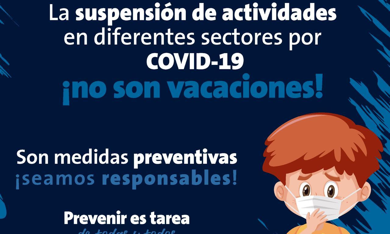 La dependencia reitera que la suspensión de actividades en los diferentes sectores por COVID-19, NO es por periodo de vacaciones, si no es una medida preventiva, por lo que se exhorta a la población a ser responsables, no acudir a lugares donde haya mayor afluencia de personas, plazas comerciales, parajes turísticos y eventos masivos.
