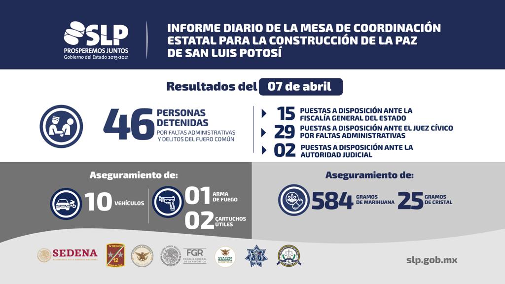 En atención a diferentes denuncias recibidas en en la Línea de Emergencias 911 durante el lunes 6 de abril, la Mesa de Coordinación Estatal para la Construcción de la Paz, en la que participan corporaciones de seguridad de los tres niveles de Gobierno, se logó detener a cinco personas, presuntamente relacionadas con el delito de narcomenudeo.