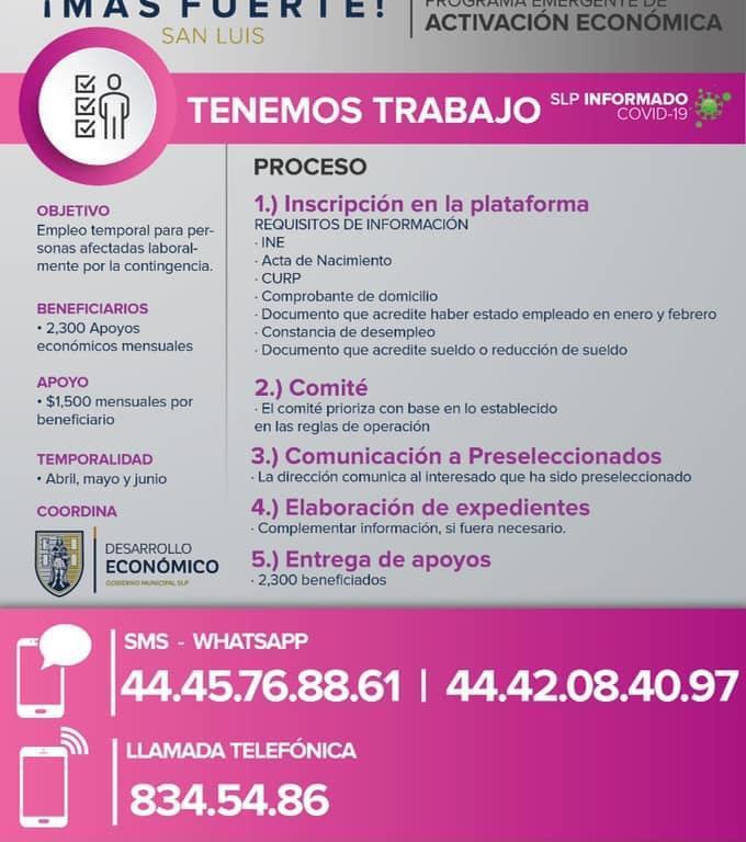 El apoyo consiste en una ayuda económica de mil 500 pesos mensuales por beneficiario, durante abril, mayo y junio; teniendo que laborar 24 horas al mes, divididas máximo en 4 jornadas.