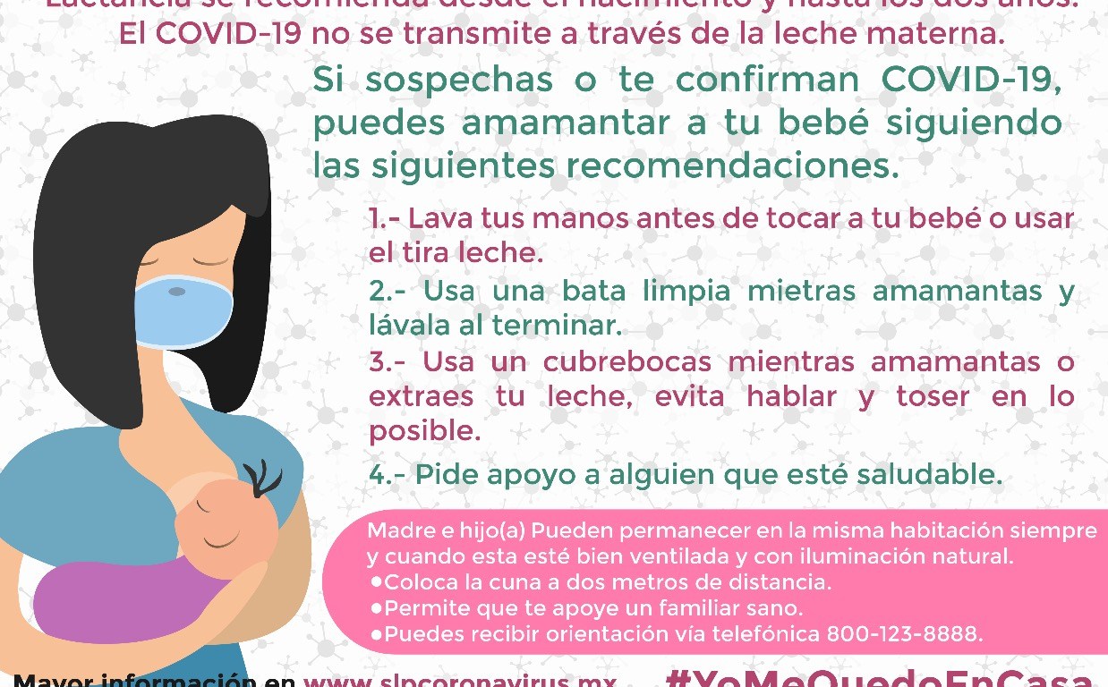 Como una medida para asegurar la alimentación de las y los recién nacidos y lactantes en general, la Secretaría de Salud emitió recomendaciones para mujeres que acaban de dar a luz y sean casos confirmados de Covid-19, o para aquellas que continúen lactando y tengan dudas sobre la probabilidad de transmisión de este virus.
