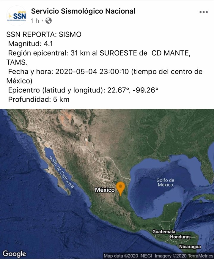 A las 23:15 hrs. se registro un Sismo de 4.1 grados que sacudió el Mante, Tamps. y se sintio en el municipio de El Naranjo.