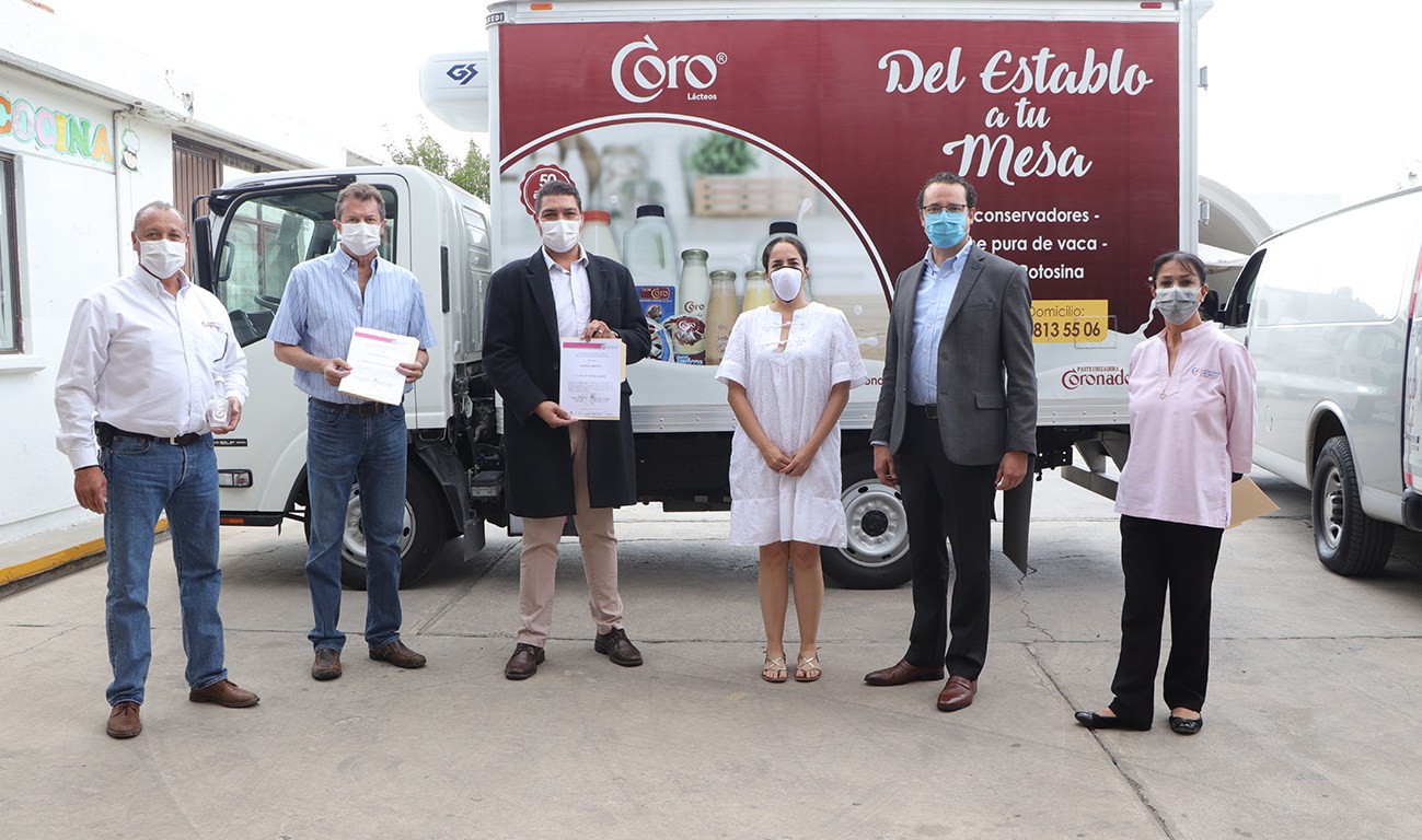Fueron los directivos de la empresa Coronado, Gerardo Hernández Andrés y de Rompope Coronado, Carlos Pérez Losando, los que entregaron en calidad de donación, un total de 10 mil productos alimenticios, entre cajeta, cocada y chongos; así como geles antibacteriales.