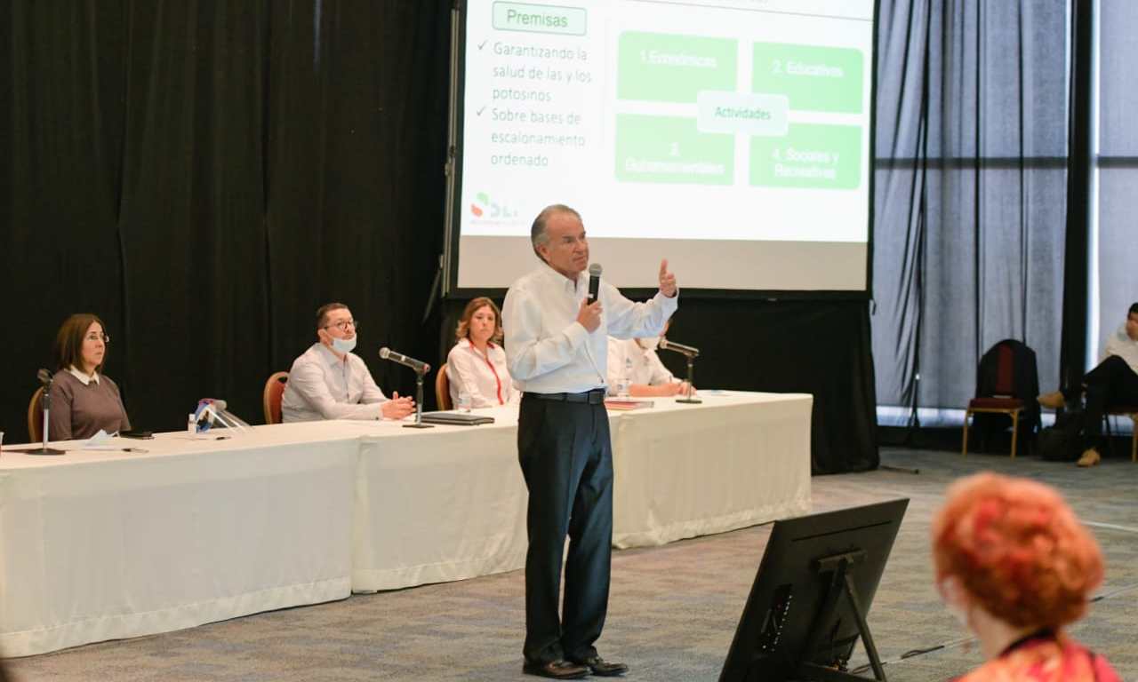 Ante líderes de cámaras empresariales, académicos, legisladores del Congreso del Estado, integrantes del Gabinete Legal y los presidentes municipales de San Luis Potosí y Soledad de Graciano Sánchez, el Gobernador del Estado, Juan Manuel Carreras López, planteó una estrategia integral, que incluye acciones responsables y transparentes para la reactivación económica ante la crisis mundial que provoca la pandemia por COVID-19, con reinicio escalonado y ordenado para los diversos sectores productivos y fortalecer las finanzas públicas.