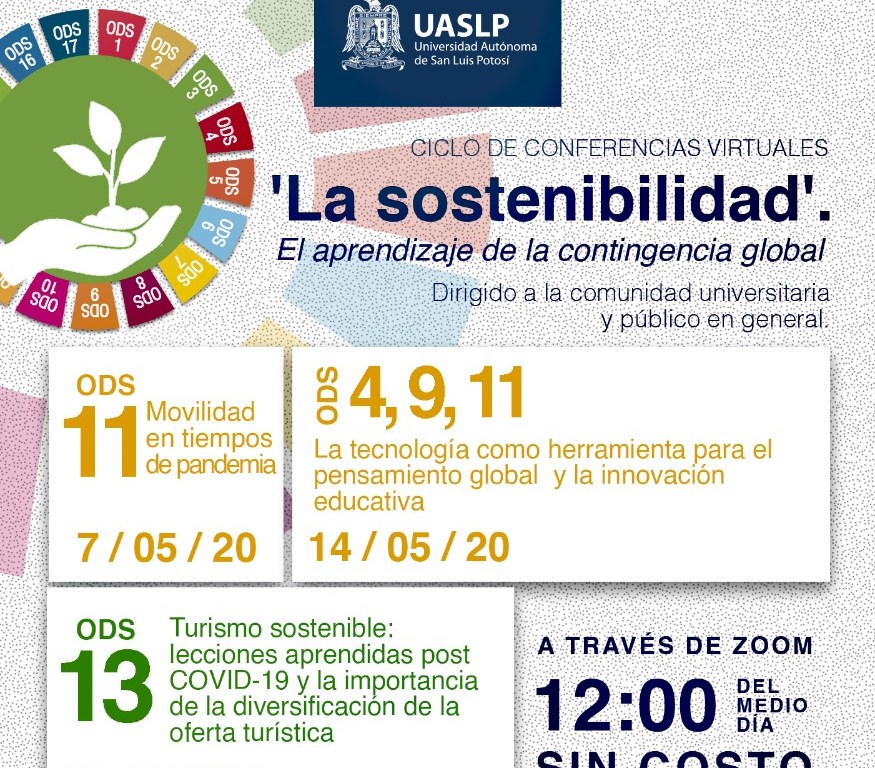 Tomando en cuenta lo anterior, la Universidad Autónoma de San Luis Potosí, a través de la Agenda Ambiental y en coordinación con la División de Servicios Estudiantiles y el programa Unisalud, han preparado un ciclo de conferencias virtuales de carácter gratuito en torno a La sostenibilidad. El aprendizaje de la contingencia global. La primera conferencia abordó la “Salud mental desde la perspectiva de los derechos humanos y los Objetivos del Desarrollo Sostenible”, en ella se contó con el psicólogo Alfredo Meza y el maestro en derechos humanos Guillermo Saldaña como ponentes, participaron más de cien personas, entre ellas, personal médico del Hospital General de Ciudad Valles.