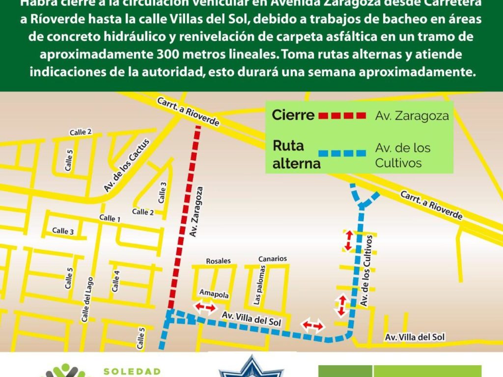 La Dirección General de Seguridad Pública de Soledad, a través de Policía Vial, informó que derivado de distintas obras en el oriente del municipio, se cerrará la circulación vehicular en Avenida Zaragoza desde Carretera a Ríoverde hasta la calle Villas del Sol, por lo que se pide a los ciudadanos y automovilistas extremar precauciones.