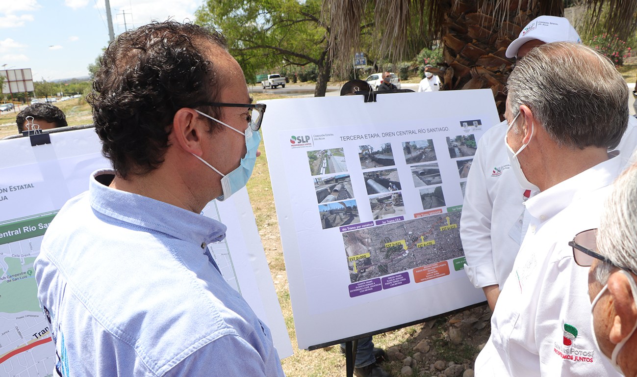En esta supervisión, el Alcalde, Xavier Nava Palacios y el Gobernador, Juan Manuel Carreras, refrendaron el compromiso de seguir conjuntando esfuerzos institucionales para mejorar las condiciones de vida de las potosinas y potosinos, con obras como ésta, que permitirá desalojar un caudal de 5 mil 500 litros por segundo para evitar que se cierre en la temporada de lluvias.