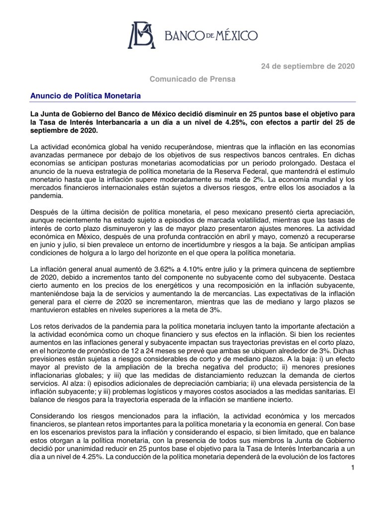 El Banco de México (Banxico) bajó este jueves la tasa de interés en 25 puntos base y la fijó en el 4.25 por ciento, en lo que supuso el sexto recorte del precio del dinero en seis meses para proveer de liquidez al mercado ante la pandemia de COVID-19.