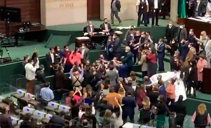 Ante la negativa de los legisladores a que dicha iniciativa se aprobara, comenzaron a tomar la tribuna, mientras legisladores de Morena les buscaban arrebatar una pancarta.