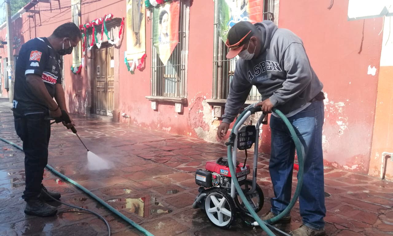 Con el objetivo de mantener en óptimas condiciones los espacios públicos de la Delegación Villa de Pozos, el área de Servicios Municipales realizó tareas de hidrolavado sobre la cantera de piedra laja sangre de pichón de la plaza principal de esta demarcación.