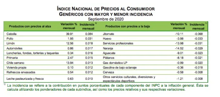 Las cifras desestacionalizadas señalan que el aumento de la inflación en la primera quincena de septiembre se debió al alza en el precio de cebolla, chile serrano y limón.