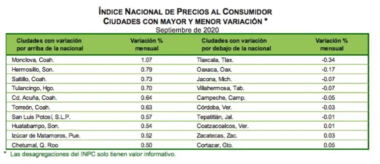 La ciudades del país con variación por arriba de la nacional fueron Monclova, Coahuila; Hermosillo, Sonora, y Saltillo, Coahuila.