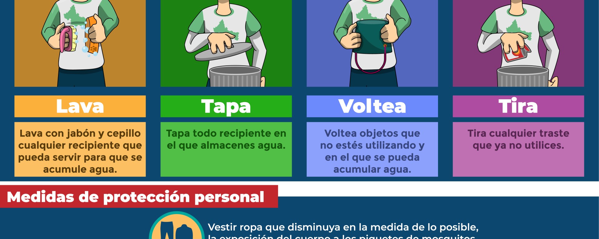 “Las medidas preventivas son sencillas y fundamentales el lavar con jabón y cepillo cubetas, piletas, tinacos, cisternas, floreros, bebederos de animales y cualquier recipiente que pueda servir para que se acumule agua y los mosquitos se reproduzcan; el tapar todo recipiente en el que se almacene agua; voltear cubetas, tambos, tinas, macetas o cualquier objeto en el que se pueda acumular agua, ya que los mosquitos buscan estos lugares para reproducirse; tirar botellas, llantas, latas o trastes que ya no se utilizan y en los que se puede acumular agua; cambiar el agua de los floreros y bebederos de mascotas cada tercer día; barrer y mantener en orden todos los espacios en los que desarrollamos alguna actividad y/o vivimos. Y es importante reforzar las medidas de protección personal como: utilizar repelente de insectos, colocar mosquiteros en puertas y ventanas y preferir vestir con camisas de manga larga y pantalones largos”.