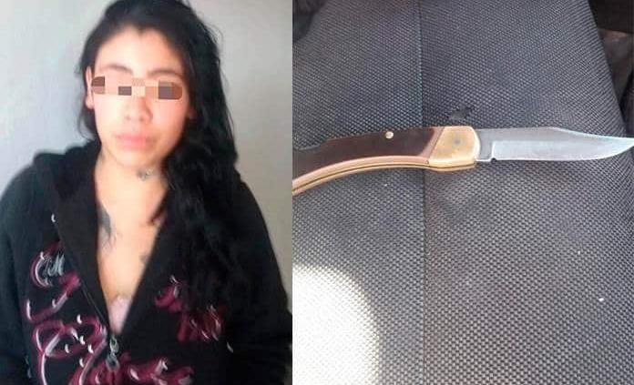 Al detectar la presencia policiaca los presuntos delincuentes emprendieron la huida en distintas direcciones, logrando la detención de una jovencita que dijo llamarse Alba Lidia y contar con 21 años, en la calle Villa del Sol que con base a una revisión traía fajado en la cintura lado derecho del pantalón (mayones) negro con gris y franjas blancas, un objeto con hoja metálica de aproximadamente 9 centímetros de largo en color gris, empuñadura plástica de 12 centímetros aproximadamente en color café.