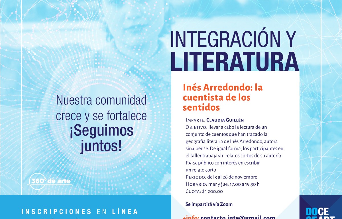 La obra de la autora sinaloense Inés Arredondo será la guía para la exploración literaria en el taller “Inés Arredondo: la cuentista de los sentidos”, que será impartido por el Centro de las Artes de San Luis Potosí Centenario del 03 al 26 de noviembre próximos, bajo la instrucción de la escritora Claudia Guillén, como parte del programa de talleres a distancia del periodo septiembre-diciembre 2020 desarrollado por dicha institución.