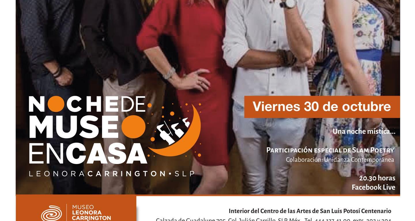 La Secretaría de Cultura de San Luis Potosí invita al público en general a la Noche de Museo, uno de los eventos más especiales del Museo de Leonora Carrington de San Luis Potosí, que se llevará a cabo de forma virtual este viernes 30 de octubre 2020, a las 20:30 h., mediante la presentación de un conjunto de actividades artísticas que deleitarán al público, tomando como eje central de la velada: la poesía, la música y el baile.